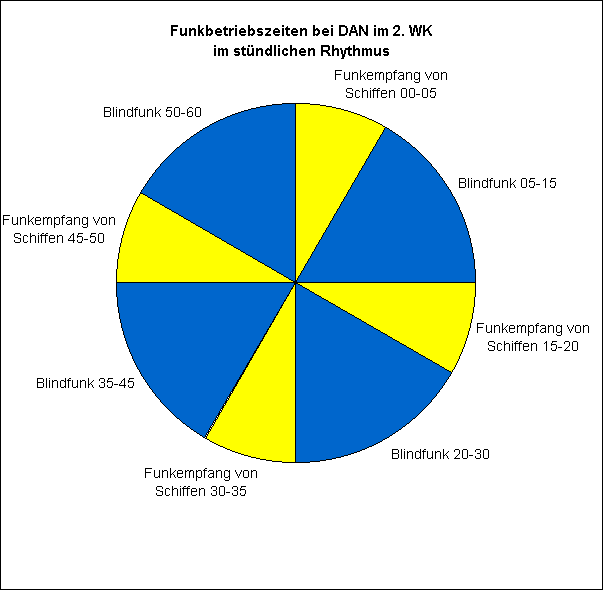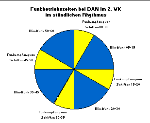 Kurz soll hier noch auf die Durchführung des Funkverkehrs bei Norddeich Radio eingegangen werden, die Aussagen von Günther Lüken und Klaus Goritzki stimmen im Wesentlichen überein. Der Inhalt der militärischen Meldungen war natürlich durch den "M-Code" (Marine-Code) abgesichert. Die Schlüsseleinstellungen änderten sich zum Teil stündlich, aber mindesten täglich. Abhängig von der Tageszeit, Jahreszeit und den Ausbreitungsbedingungen erfolgten die Aussendungen auf verschiedenen Frequenzen nach einem bestimmten Hörbereitschafts- und Sendeplan. Der stündliche Ablauf des Empfangs und Übermittlung der Nachrichten ist in der nebenstehenden Grafik ersichtlich. Zu den festen Programmzeiten wurde der Blindfunk von Norddeich Radio gestoppt und auf der eigenen Frequenz ("Schwebungsnull") die Meldungen der Schiffe empfangen. Die Schiffsmeldungen wurden verschlüsselt, als Kurzsignal und "blind" gestrahlt. Die Empfangsbestätigung erfolgte nicht unmittelbar, sondern erst im folgenden Blindfunk von Norddeich Radio. Der Inhalt dieses Blindfunks war vorwiegend militärisch, enthielt aber auch private Meldungen an Besatzungs- mitglieder von Angehörigen an Land. |