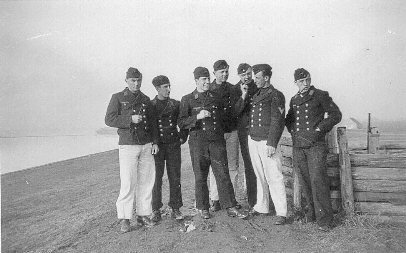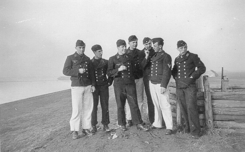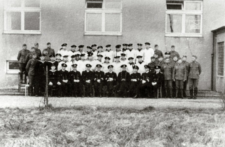 trugen feldgraue Uniformen mit Abzeichen und Knöpfen der Marine.