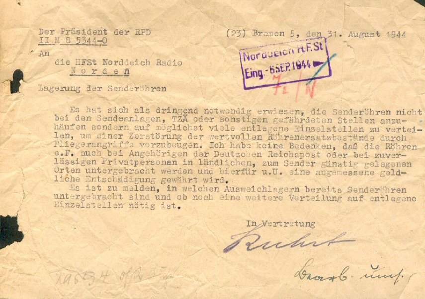 erhielten die Antwort, daß die Sender von der Empfangsfunkstelle und Betriebszentrale Utlandshörn fernbedient ein- und ausgeschaltet und getastet würden. Daraufhin zerstörten sie die Röhren