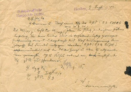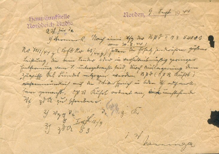 Sofort nach Kriegsausbruch wurde bei der Empfangsstelle in Utlandshörn ein Marine‑Kommando "Marine‑Nachrichten‑Offizier Norddeich“ (MNO) aufgestellt. Offiziere und Mannschaften wurden in zwei eigens dafür errichteten Baracken auf dem Gelände der Empfangsstelle untergebracht. Das Personal von Utlandshörn und Norddeich wurde durch den MNO für die Dienste des Oberkommandos der Kriegsmarine (OKM) verpflichtet.Vom Tage des Kriegsausbruchs an mußten alle aufgenommenen Nachrichten dem Marine‑Nachrichten‑Offizier vorgelegt werden, der sie an das OKM weiterleitete. Die Soldaten des Marine-Kommandos in Norddeich verrichteten zunächst nur Beobachtungsdienste. Da das OKM umgehend Nachrichten- Verbindung mit den Hilfskreuzern, den Versorgungsschiffen und den Blockadebrechern aufnehmen wollte, wurde die Betriebs- Leitung in Norddeich beauftragt, zu diesem Zweck Wellenpläne aufzustellen und ein Übermittlungsverfahren auszuarbeiten, das die Geheimhaltung des Inhalts verbürgte. |
