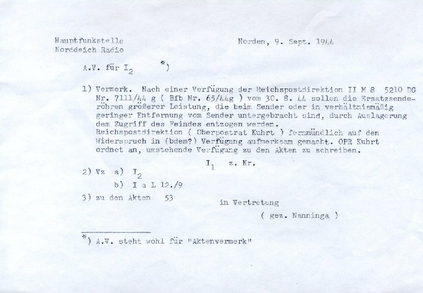 Fritz Janssen zitiert einen Zeitzeugen: "Die Briten hatten zunächst die Sendefunkstelle Norddeich besetzt und dem Personal verboten, die Sender weiter zu betreiben. Als sie dann