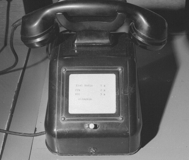 Direct connection to Kiel Radio This ancient telephone was located near the distress position "500 kHz" for direct connection to Kiel Radio (Baltic Sea). A wisecracker added following to the label: "FFB 2x rings, WCC 3x rings" |
