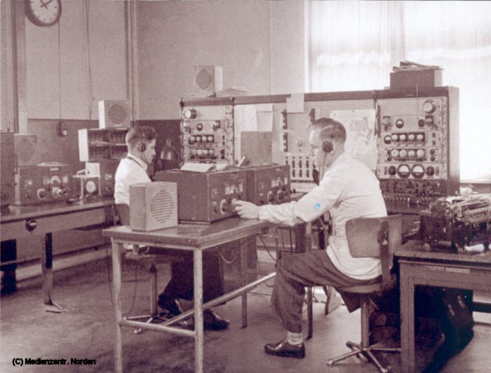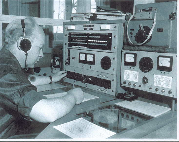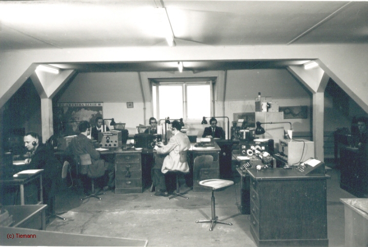 Short Wave Position Hugo Wegener keeps watch. On the right side two "Telefunken E454 Bs"-Receivers. (Photo from the early 50's. Thanks to Frank Wegener) |
